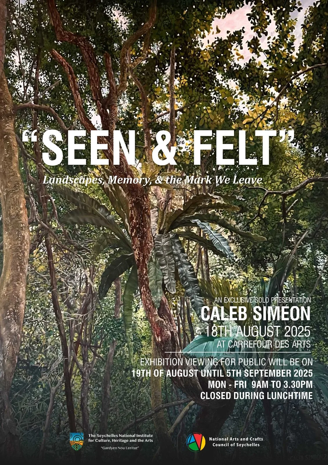 Seen & Felt Admin 18th August 2025 No Comments in Blog The opening of Caleb Simeon’s exhibition, a young Seychellois realist Artist whose work captures the essence of the island life. The exhibition will be open for public viewing as of tomorrow 19th August to 5th September 2025 from 9am to 3.30pm. https://www.nacseychelles.sc/wp-content/uploads/2025/10/534698147_1396182249181423_9159655510795282288_n.webp 1131 1600 Admin Admin https://secure.gravatar.com/avatar/f21c104fc3e31c21cfd96b8f7e2697ee?s=96&d=mm&r=g 18th August 2025 2nd October 2025